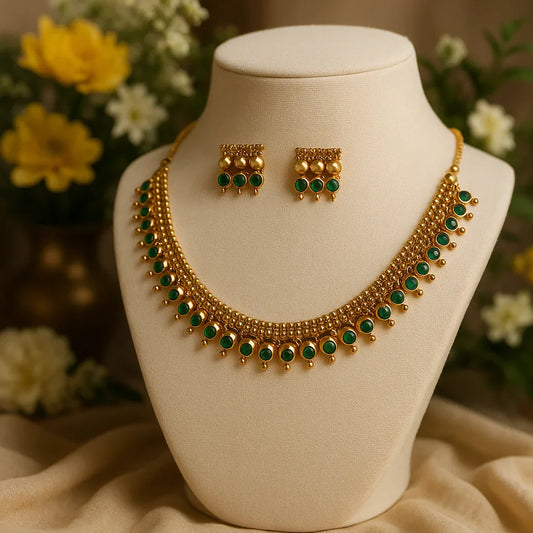 Gold Plated Green Stone Traditional Necklace Set for Women | Ethnic Jewellery with Earrings | Festive Wear, Wedding Wear & Daily Fashion